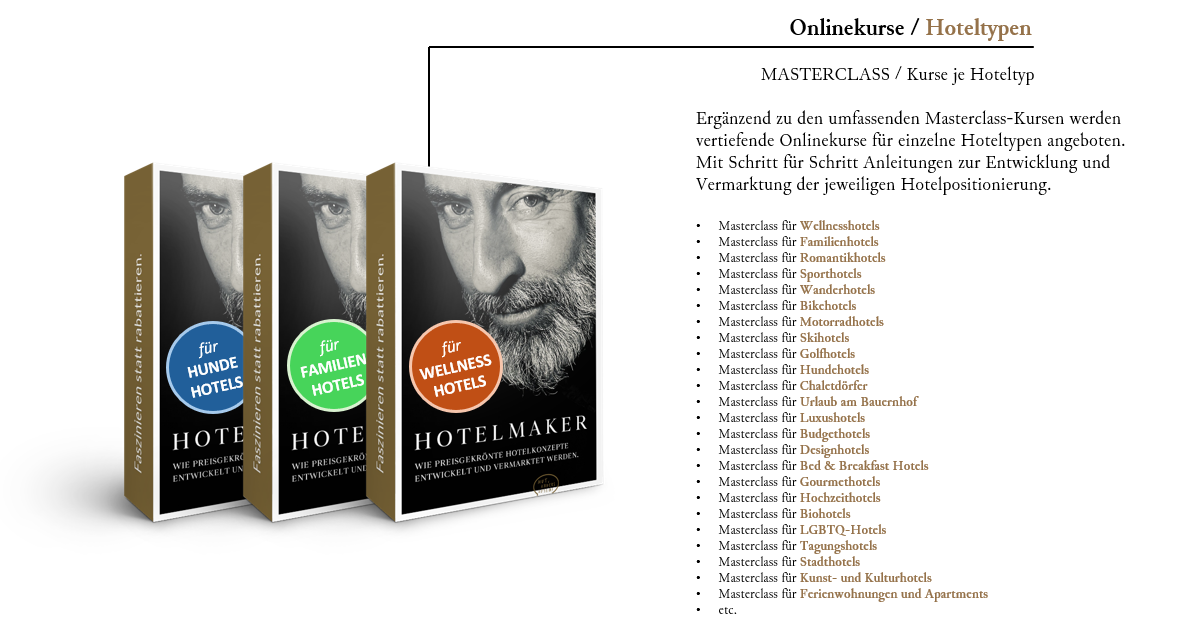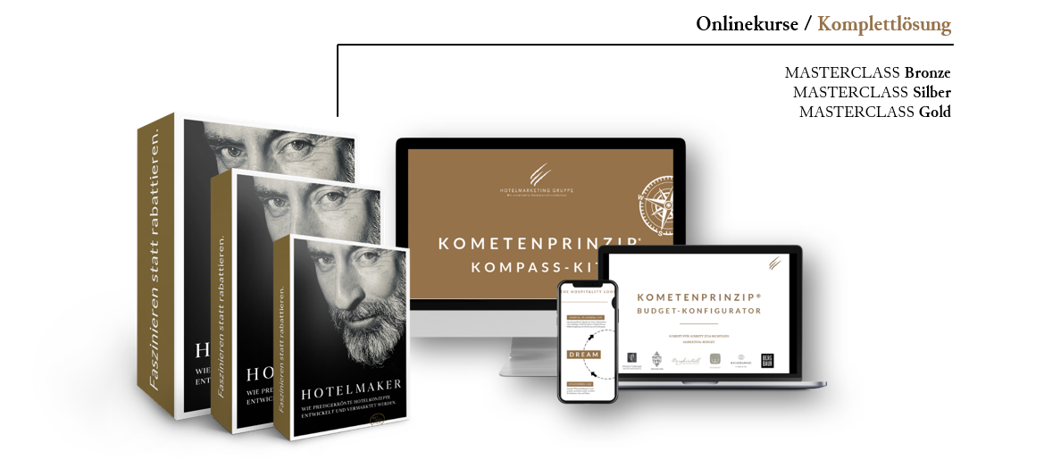 Die ganzheitlichen Onlinekurse sind speziell für die mittelständische Privathotellerie konzipiert. Sie ermöglichen Hoteliers und ihren Mitarbeitern auf Basis des erfolgserprobten Kometenprinzip ® Schritt für Schritt zu erlernen, wie außergewöhnliche Hotelkonzepte entwickelt und umgesetzt werden und eine ganzheitliche Vermarktung Wunschgäste anzieht. Es gibt 3 Masterclass Komplettkurse, die sich in der Themenanzahl und Tiefe unterscheiden: Bronze, Silber und Gold.